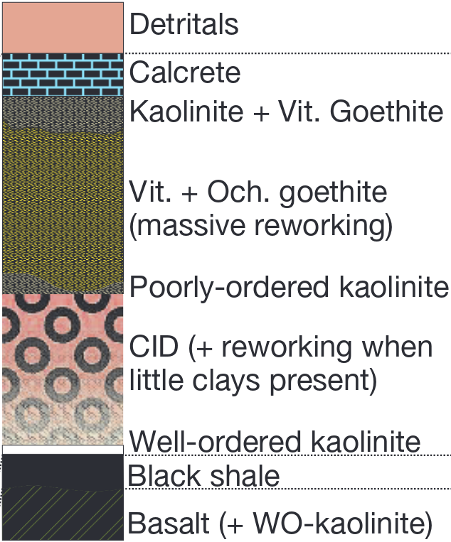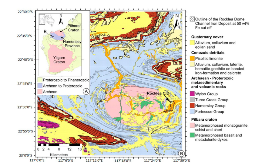 Finally, in this area, a plaeochannel, very rich in iron and intersecting all the formations studied previously, has been extensively studied. This channel had its source in the Hamersley group, which explains the interest of the industry, because of its richness in iron. This formation is mainly characterized by an abundance of pisolite limonite (ooid greater than 2mm), organized in banks between 15 and 45m high. This facies contains a large number of different ferric detritus, goethite, hematite and iron oxides in general. The most likely hypothesis as to its formation is that pieces of detrital goethite and hematite were carried away by meteoric waters, served as nuclei, and were covered during their displacement by the natural precipitation of goethite, to form glassy cortex ooids. The rock is also cemented by geothite, younger than the elements, whose age varies according to the zone or one takes the rock, and the availability of water of the zone during the precipitation of the matrix.